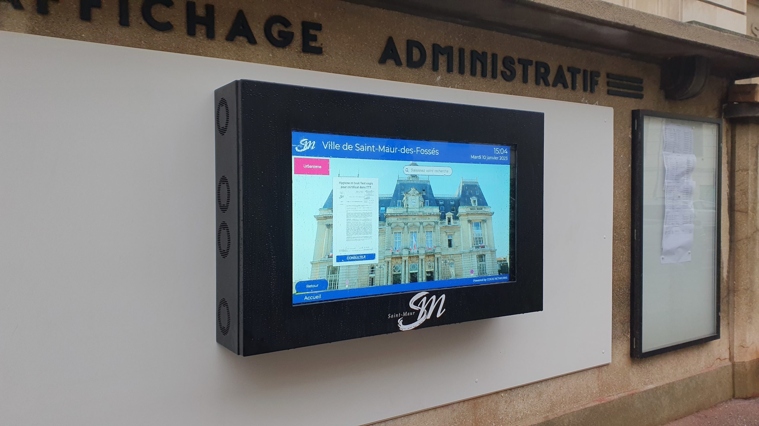 Mise en place d’une borne murale tactile d’extérieur 43 pouces pour l’affichage légal de la mairie.