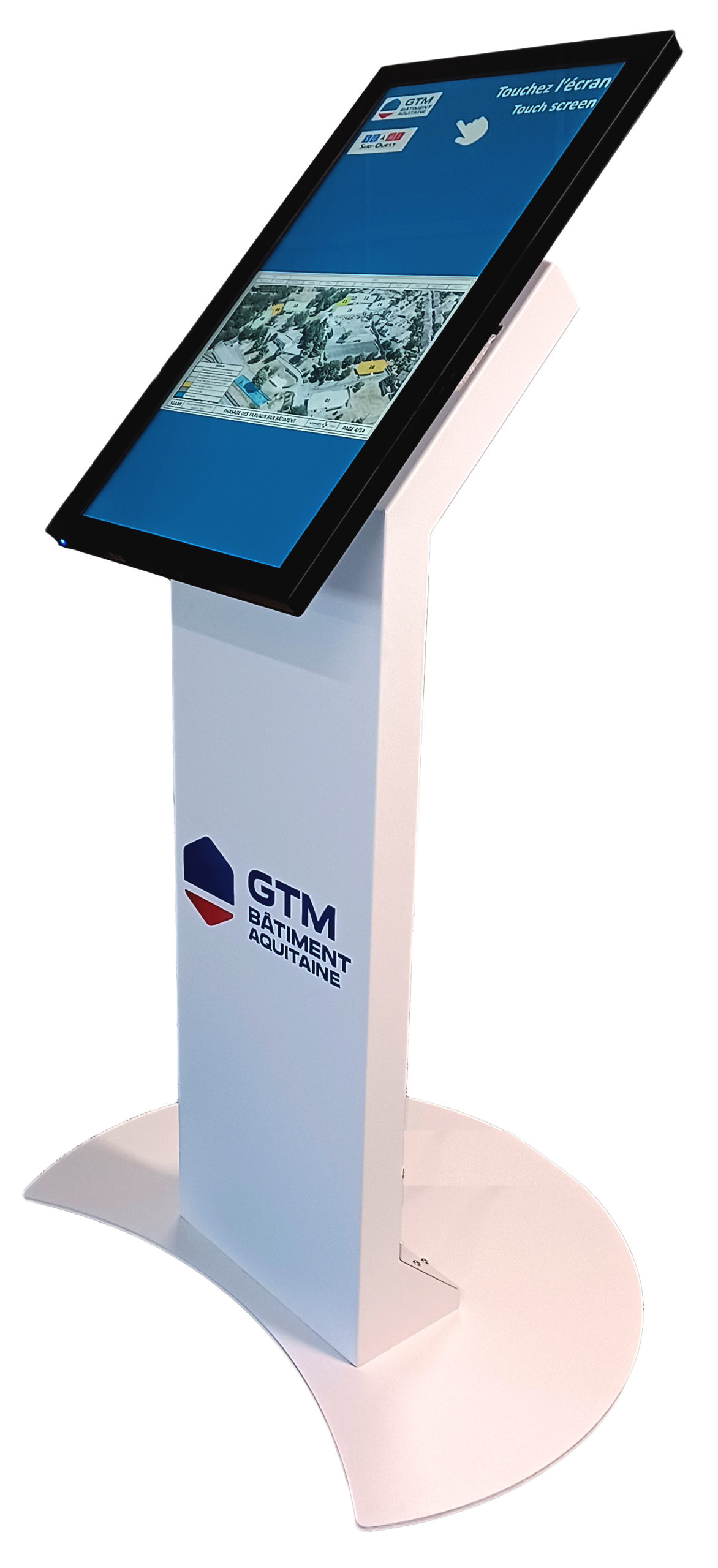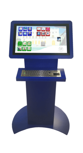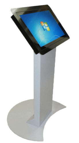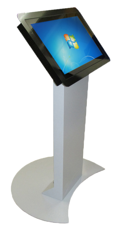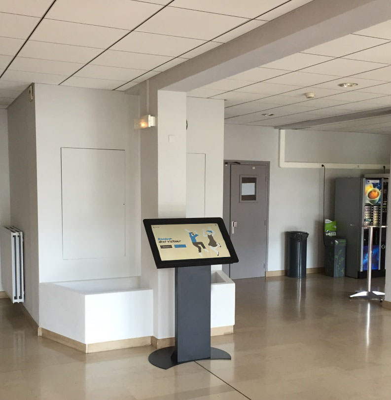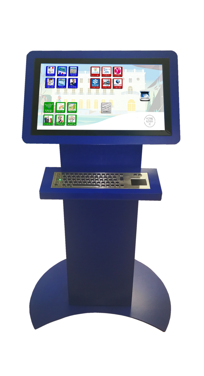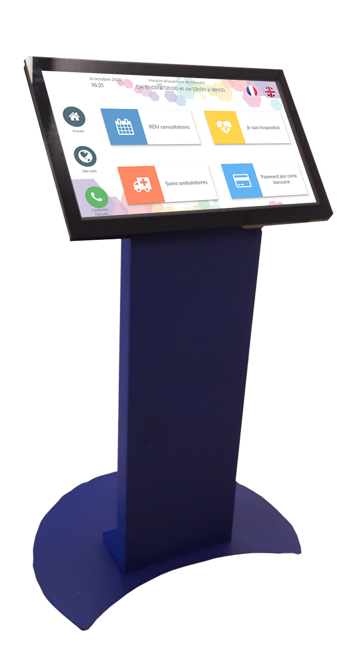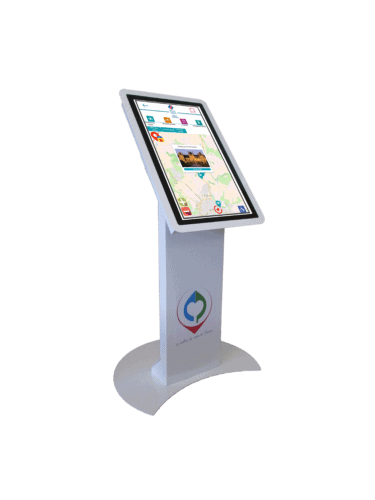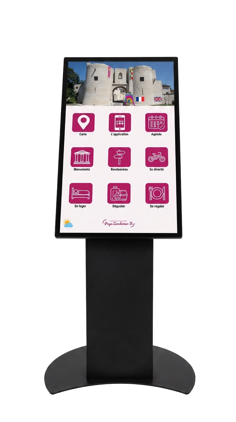 Borne tactile intérieure type pupitre, équipée d’un écran 24, 27, 32 ou 43 pouces en mode portrait ou paysage pour s’adapter à tous vos usages.