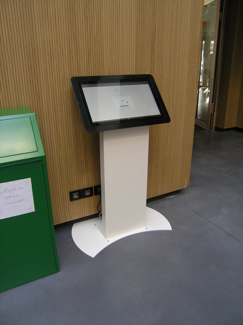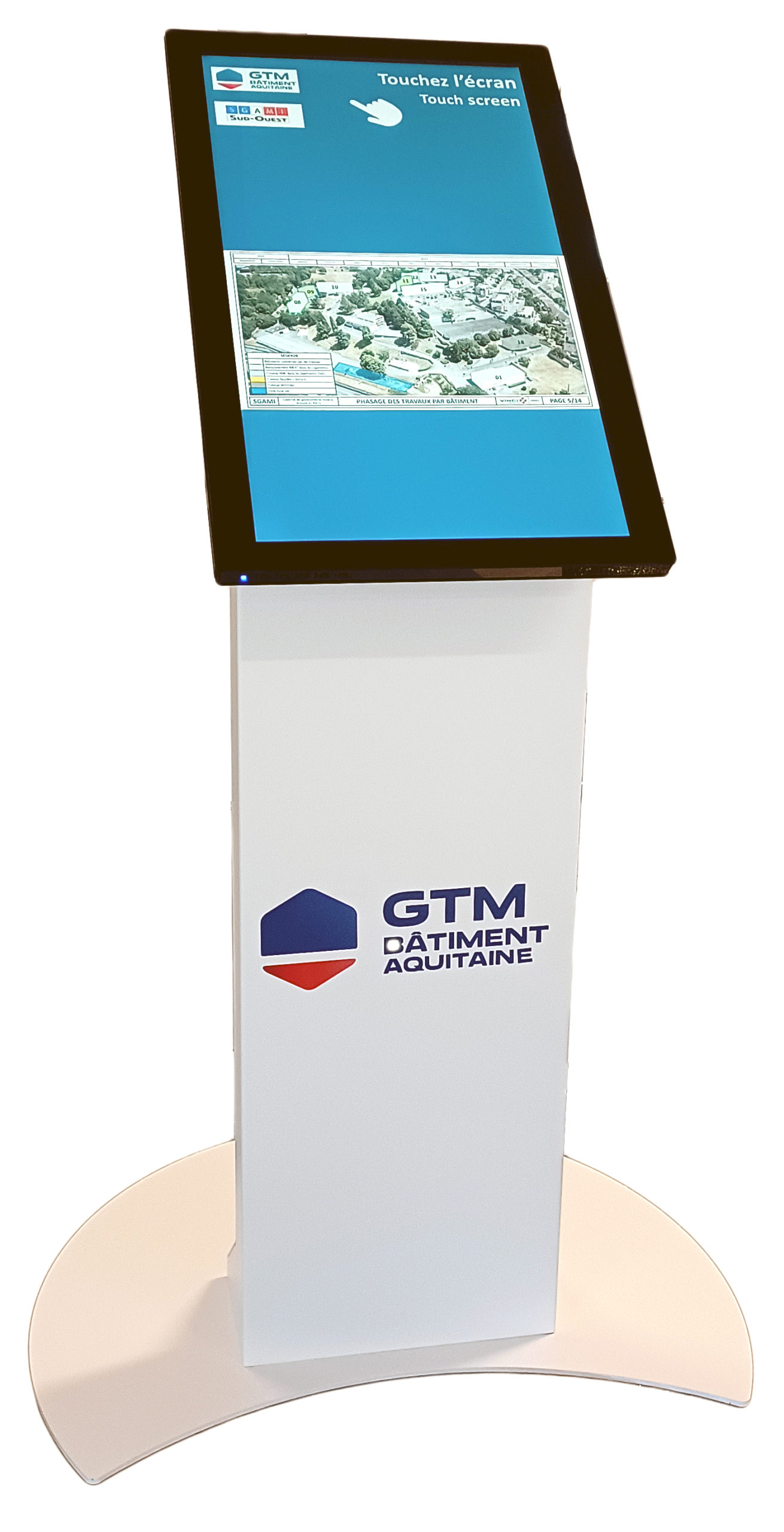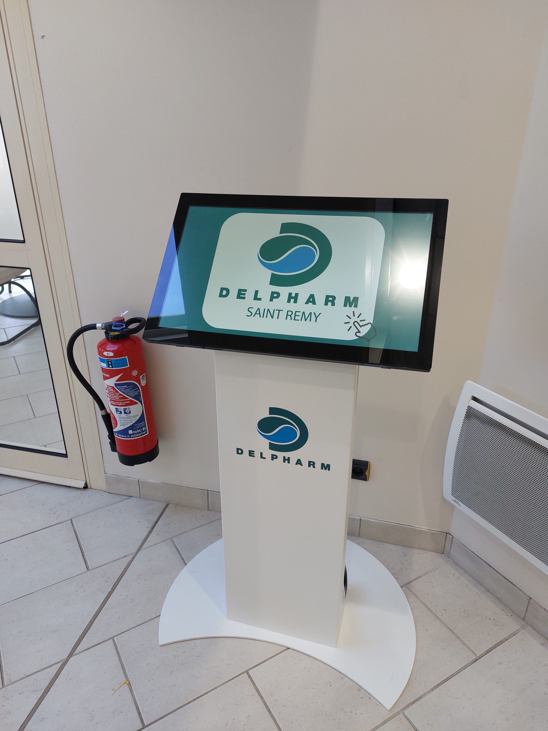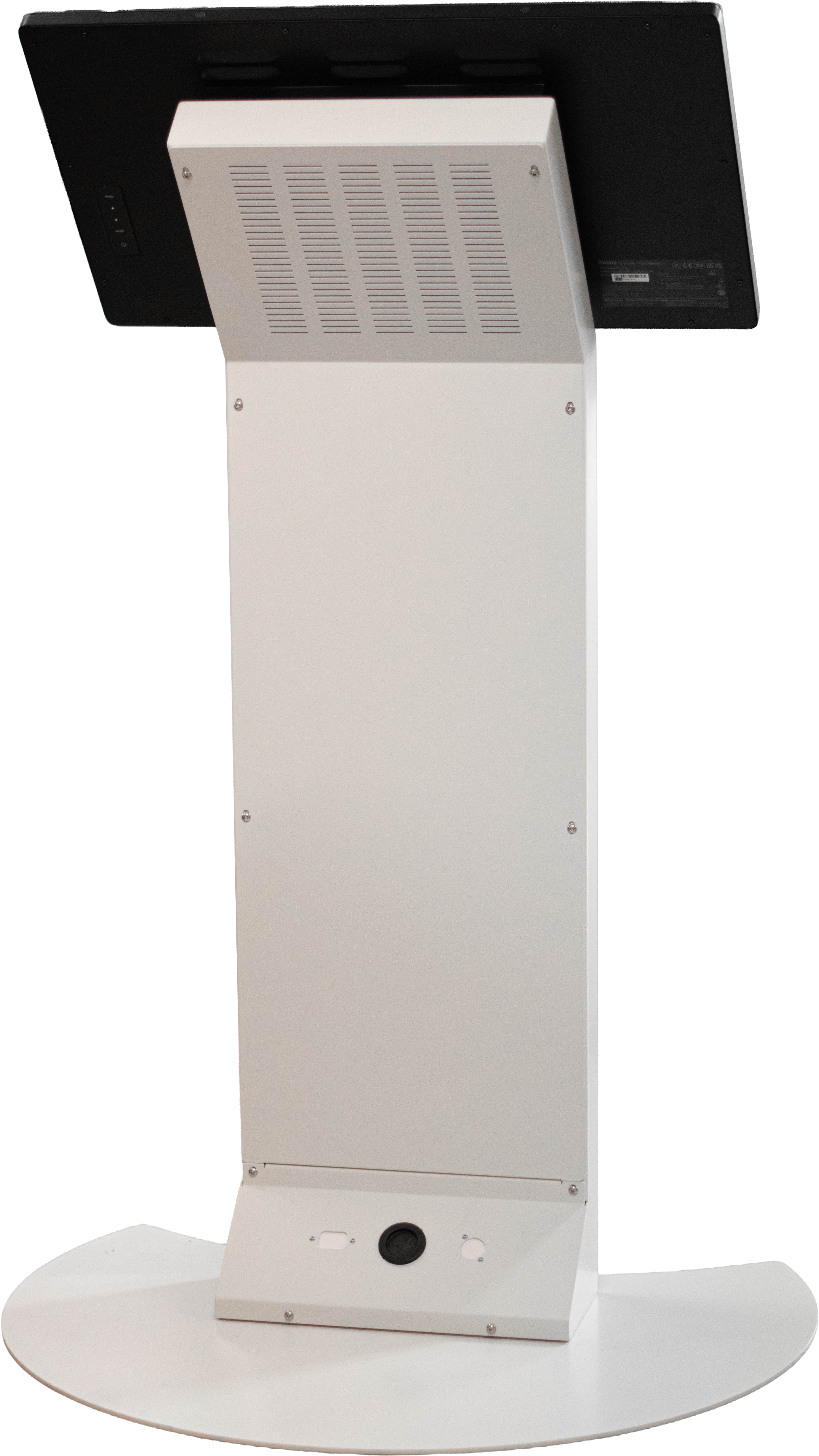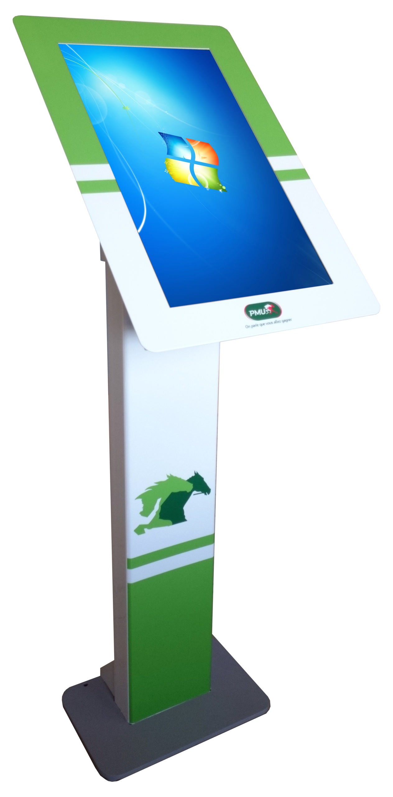 Borne tactile intérieure type pupitre, équipée d’un écran 24, 27, 32 ou 43 pouces en mode portrait ou paysage pour s’adapter à tous vos usages.