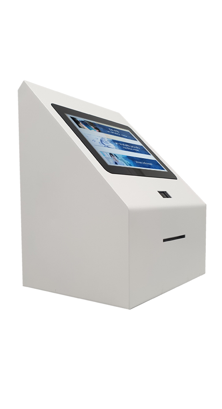 Borne interactive de comptoir intégrant une tablette tactile 10.1 pouces sous Windows ou Android, prête à s’adapter à vos applications spécifiques.