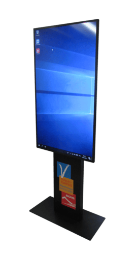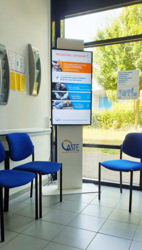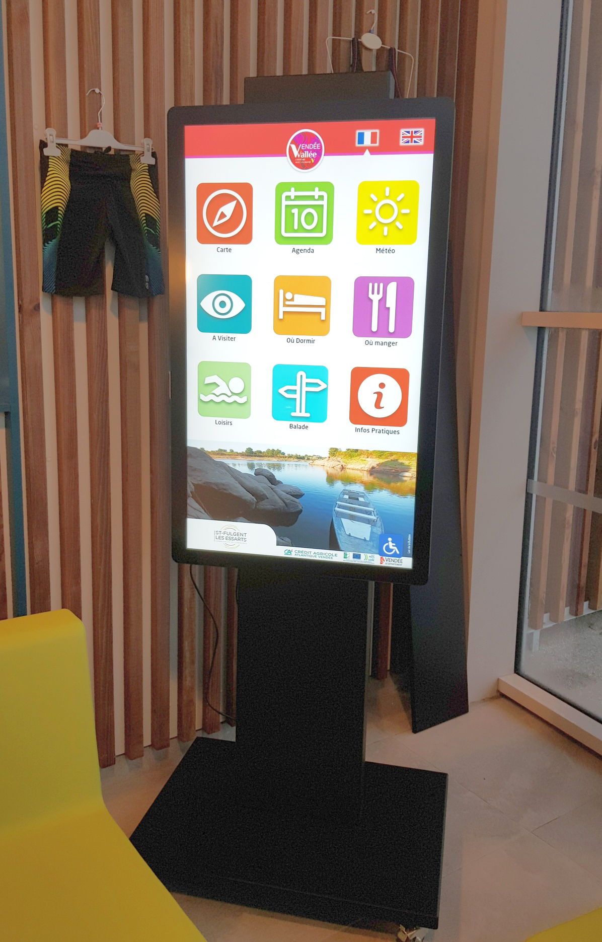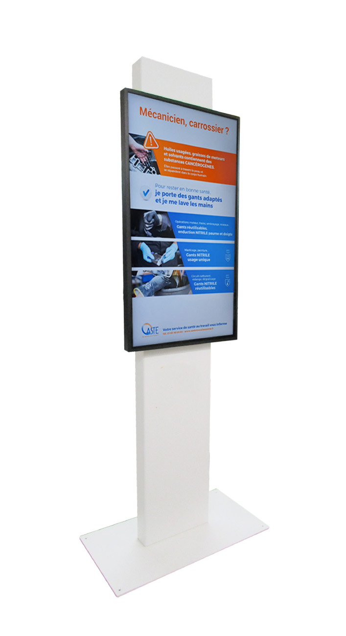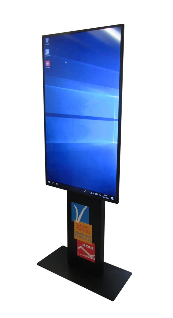 Totem tactile ou d’affichage dynamique intérieur FlexTotem en 50, 55, 55, 65 ou 75 pouces, fabriqué en France avec finition couleur RAL au choix pour une intégration parfaite.