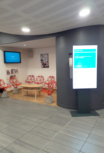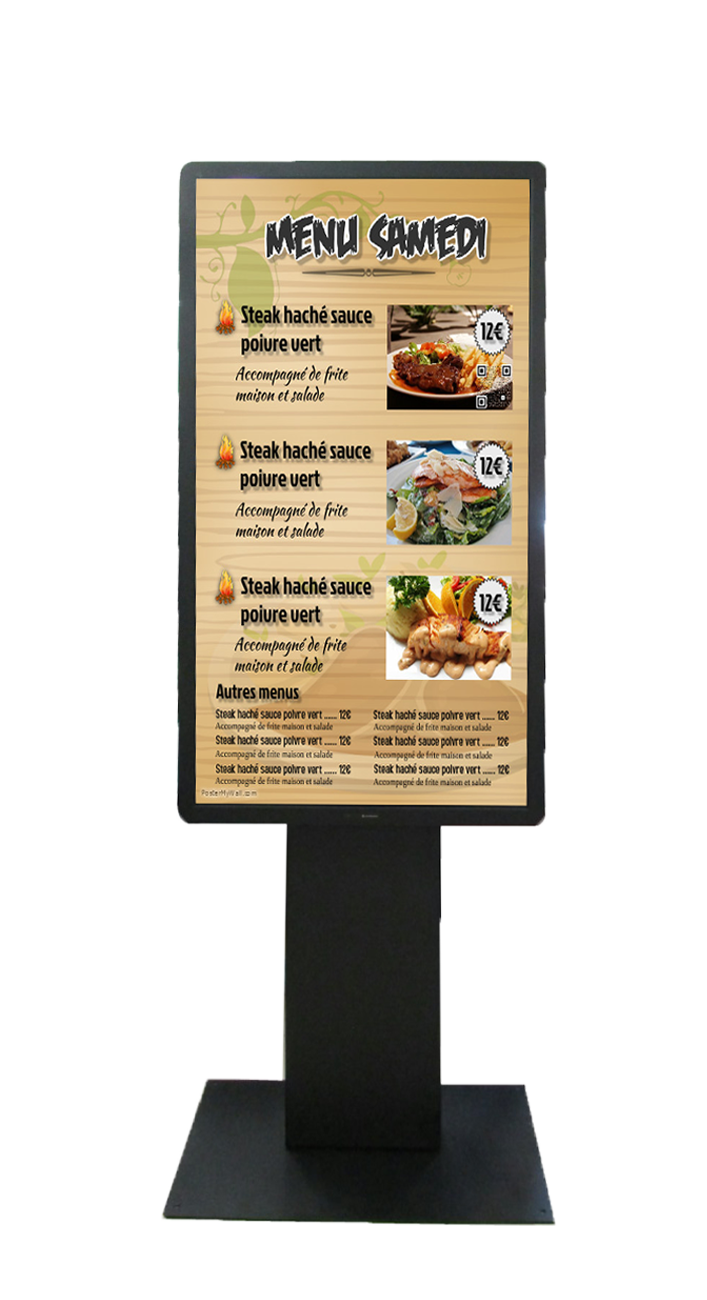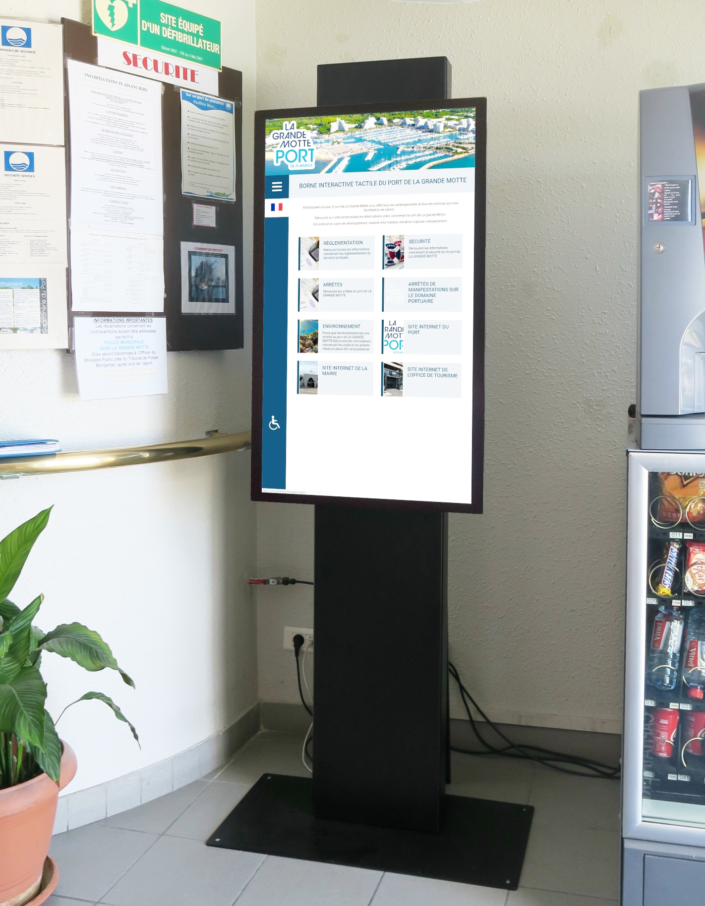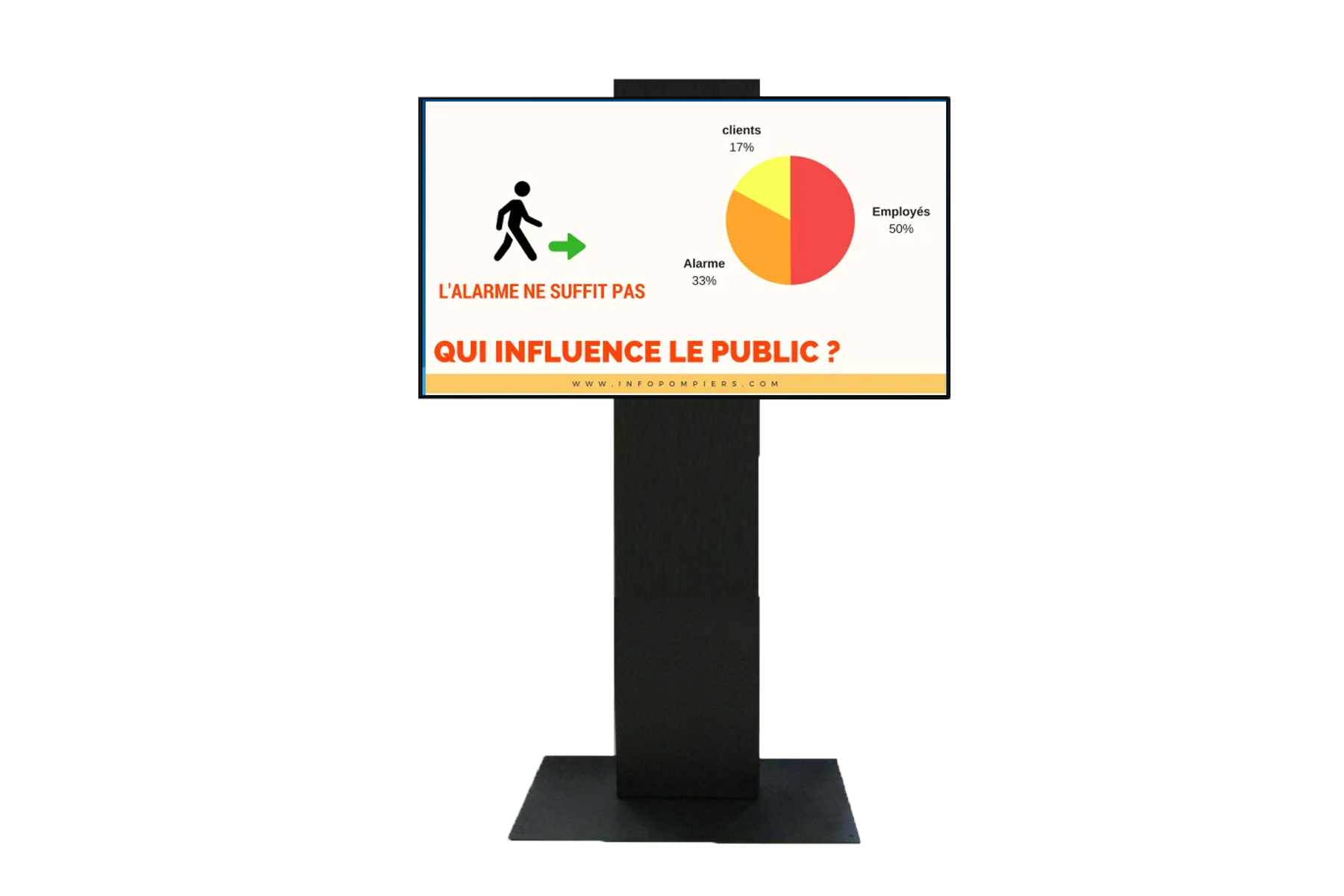 Totem tactile ou d’affichage dynamique intérieur FlexTotem en 50, 55, 55, 65 ou 75 pouces, fabriqué en France avec finition couleur RAL au choix pour une intégration parfaite.