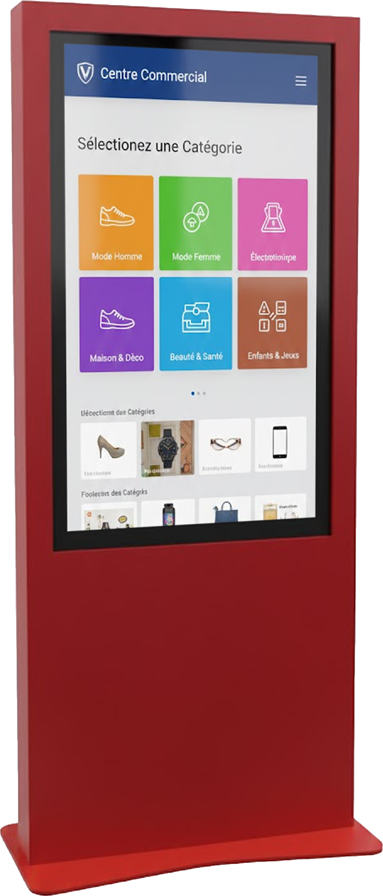 Totem d’affichage ou tactile intérieur en 43 & 55 pouces, à structure en acier robuste avec couleur au choix sur nuancier RAL pour une intégration impeccable.